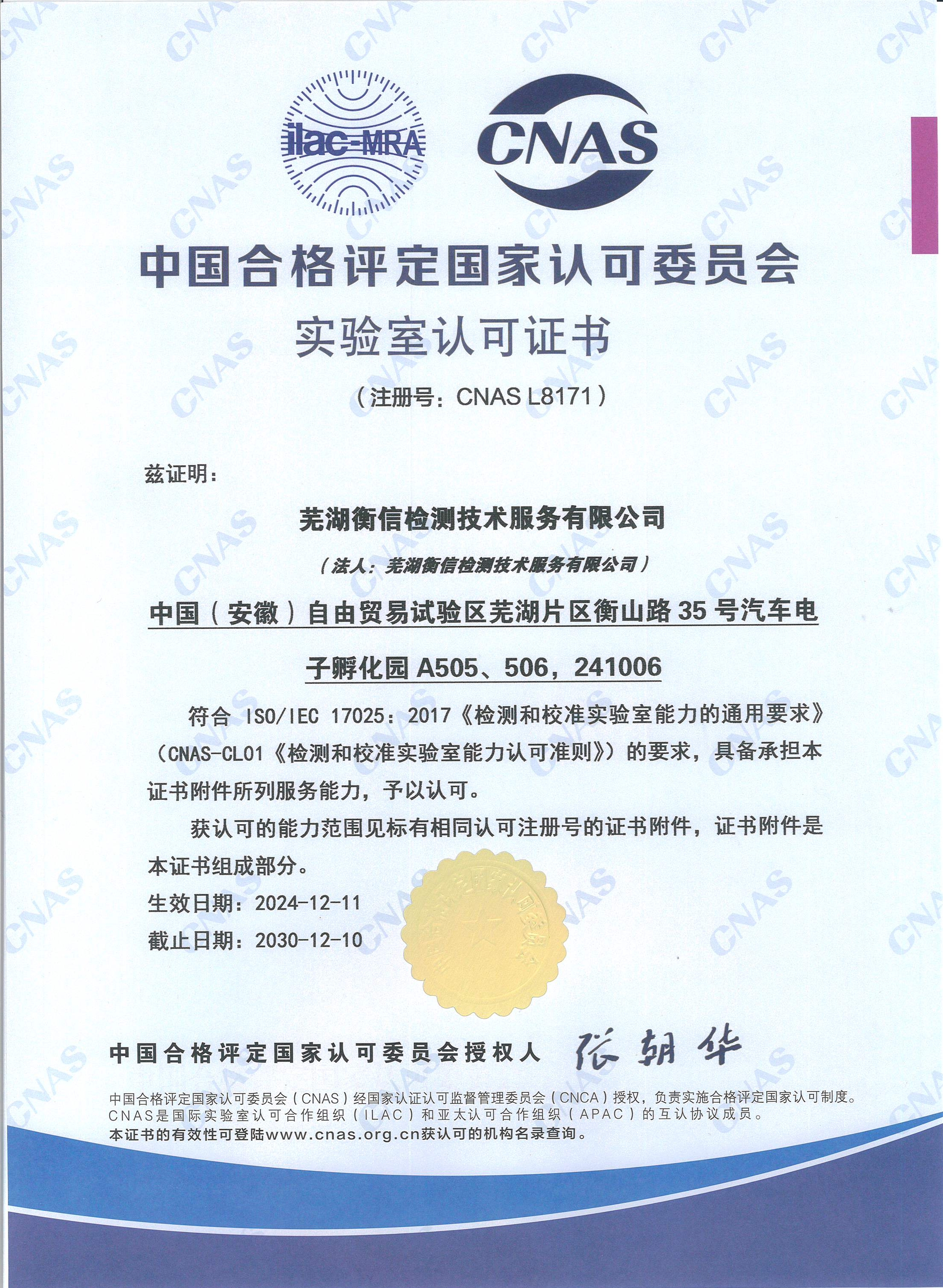 蕪湖衡信于2015年11月通過了中國合格評定國家認(rèn)可委員會(CNAS)的校準(zhǔn)和檢測實(shí)驗(yàn)室認(rèn)可(證書號:CNAS L8171),現(xiàn)有CNAS認(rèn)可校準(zhǔn)能力220項(xiàng),可在幾何量、熱學(xué)、力學(xué)、電學(xué)、化學(xué)等多個(gè)領(lǐng)域?yàn)閺V大企事業(yè)單位提供第三方計(jì)量校準(zhǔn)技術(shù)服務(wù)。